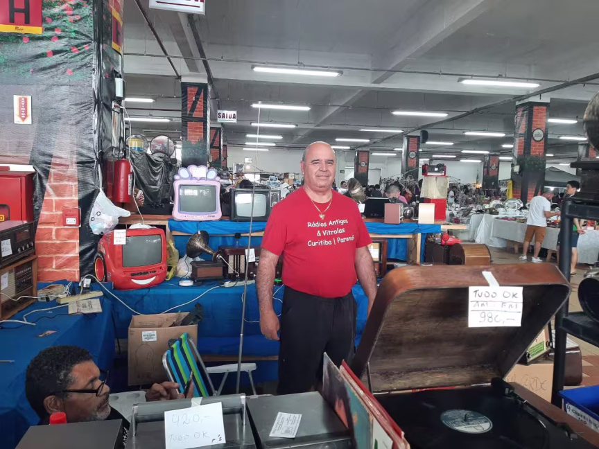 "Eu colecionava rádios antigos, fabricados entre as décadas de 30, 40 e 50. Eu cheguei a ter 350 rádios em casa, tudo funcionando, mas aí achei que chegou a hora de começar a me desfazer e tenho vendido. Mas isso aqui é só 10% ou 15% do que eu tenho de rádios. Ocasionalmente eu ainda garimpo, tanto nas feiras que participo quanto na internet, mas não viajo porque se não minha família me mata", conta.