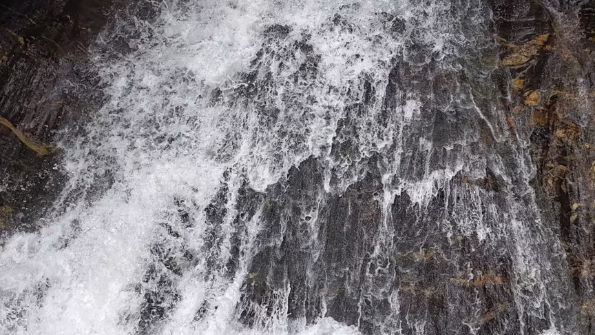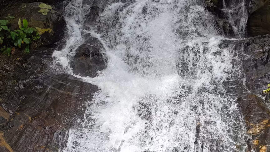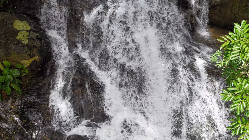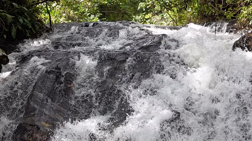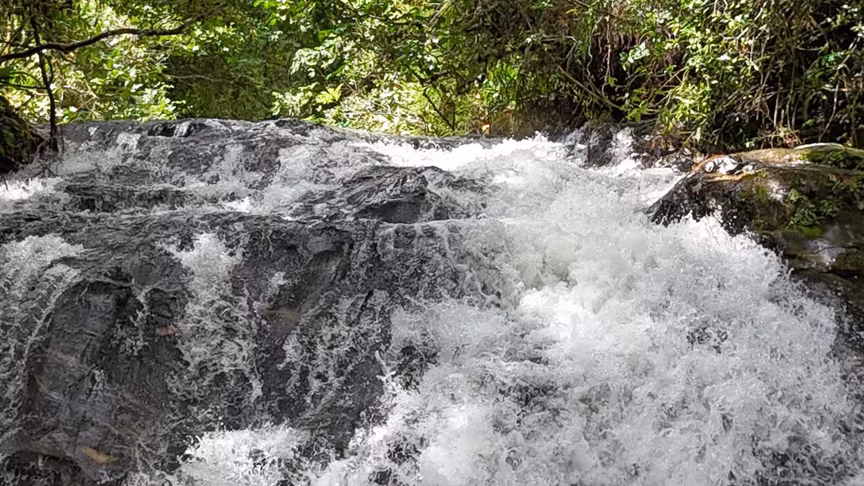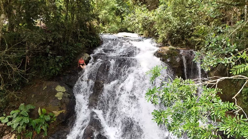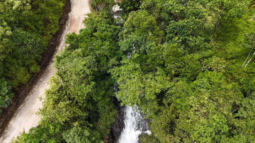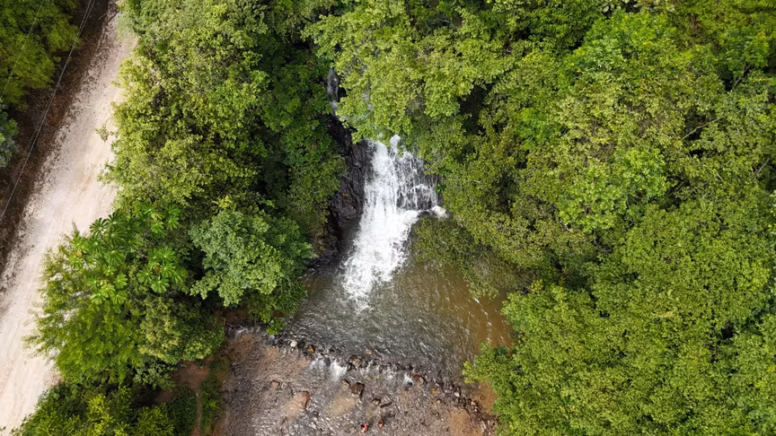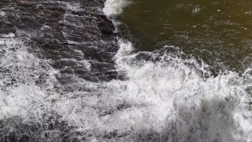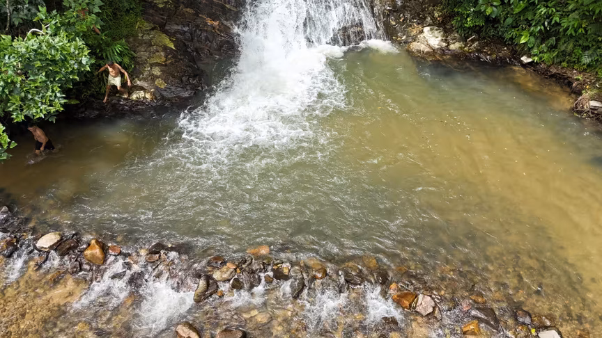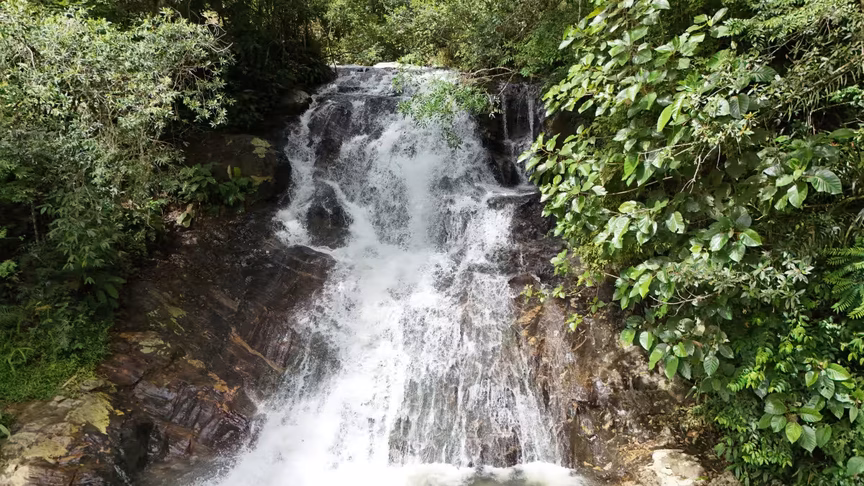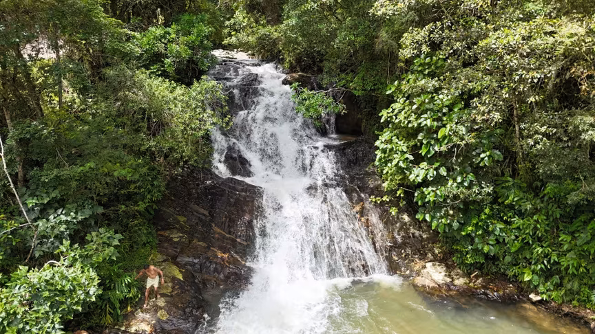 Nas cenas capturadas por drone, é possível ver a vegetação densa emoldurando a queda d'água, enquanto a espuma branca se dissipa na superfície.