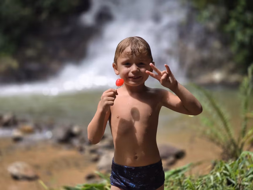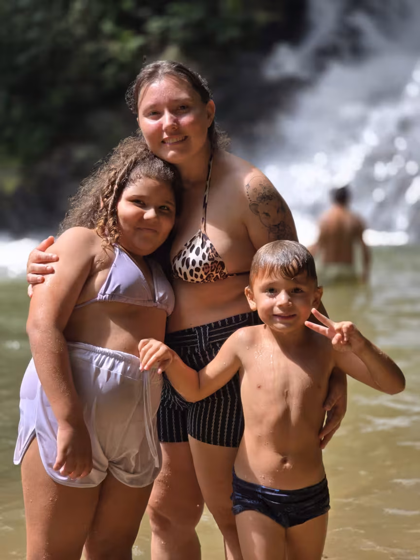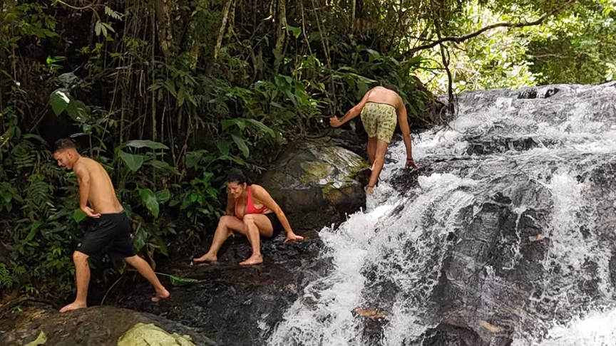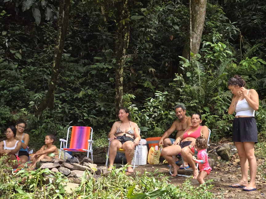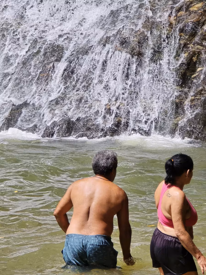 Crianças brincavam sob a queda d'água, enquanto famílias se reuniam para momentos de lazer e descanso, tudo envolto por um clima de leveza e descontração.