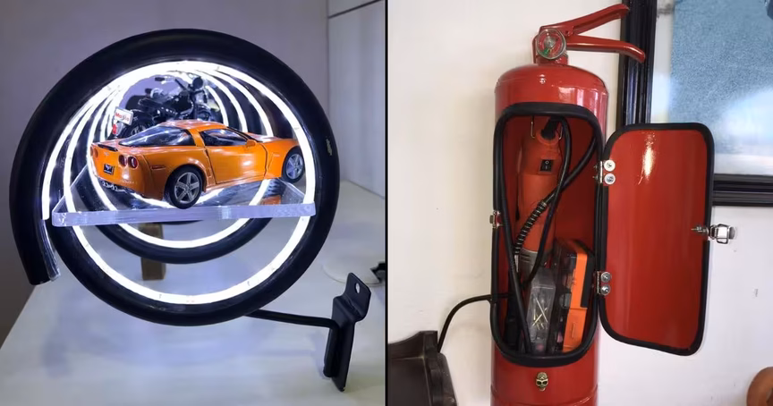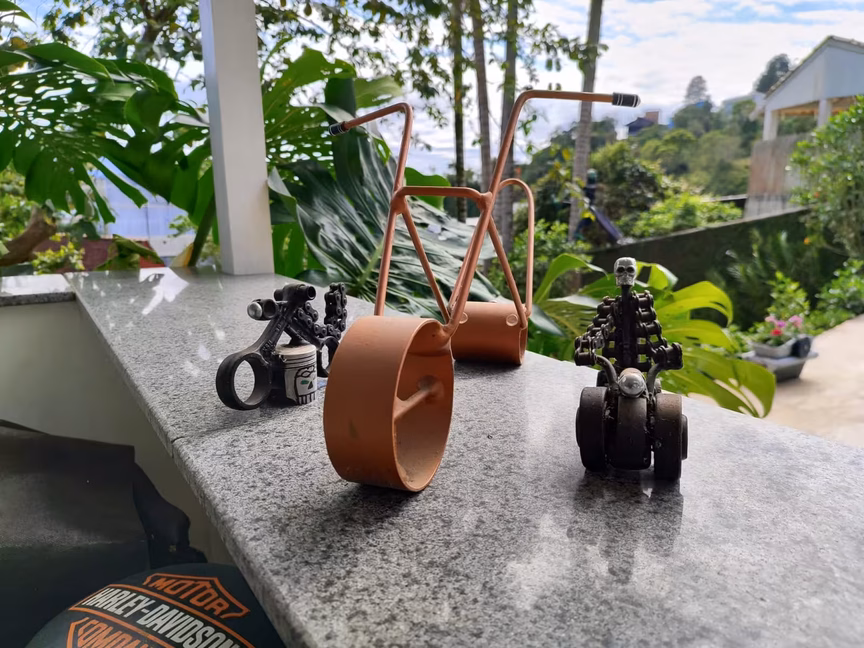 Apaixonado por motocicletas, o morador do Azambuja relembra parte de sua história ao rever as obras. Muitas das peças criadas possuem elementos e peças do mundo automotivo.