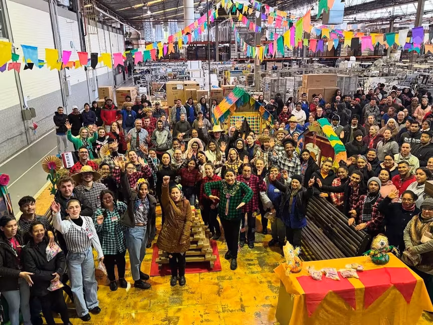 No fim da manhã desta quarta-feira, 25, a tradicional festa junina da empresa transformou os corredores da fábrica em um verdadeiro arraiá, então repleto de cores, sabores e sorrisos.