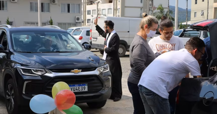 O Drive-Thru do Bem inicia às 9h e segue até às 17h, no estacionamento da igreja Matriz, no Centro. Haverá também a bênção dos carros que passarem pelo local, das 9h às 12h.