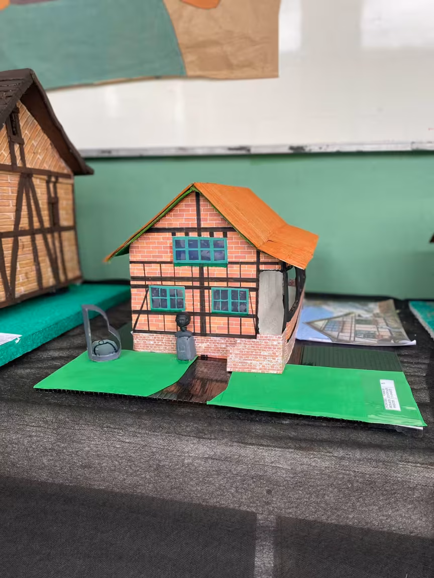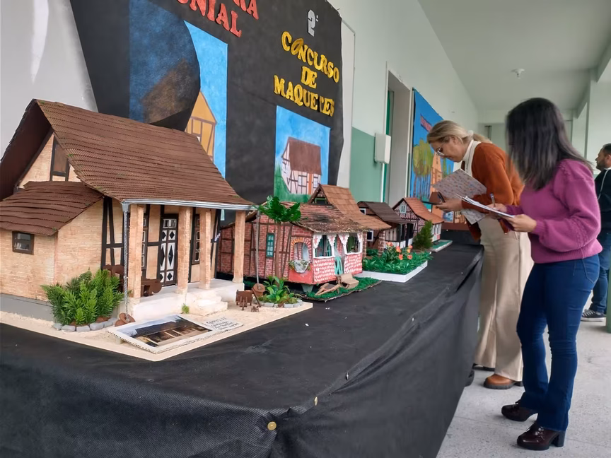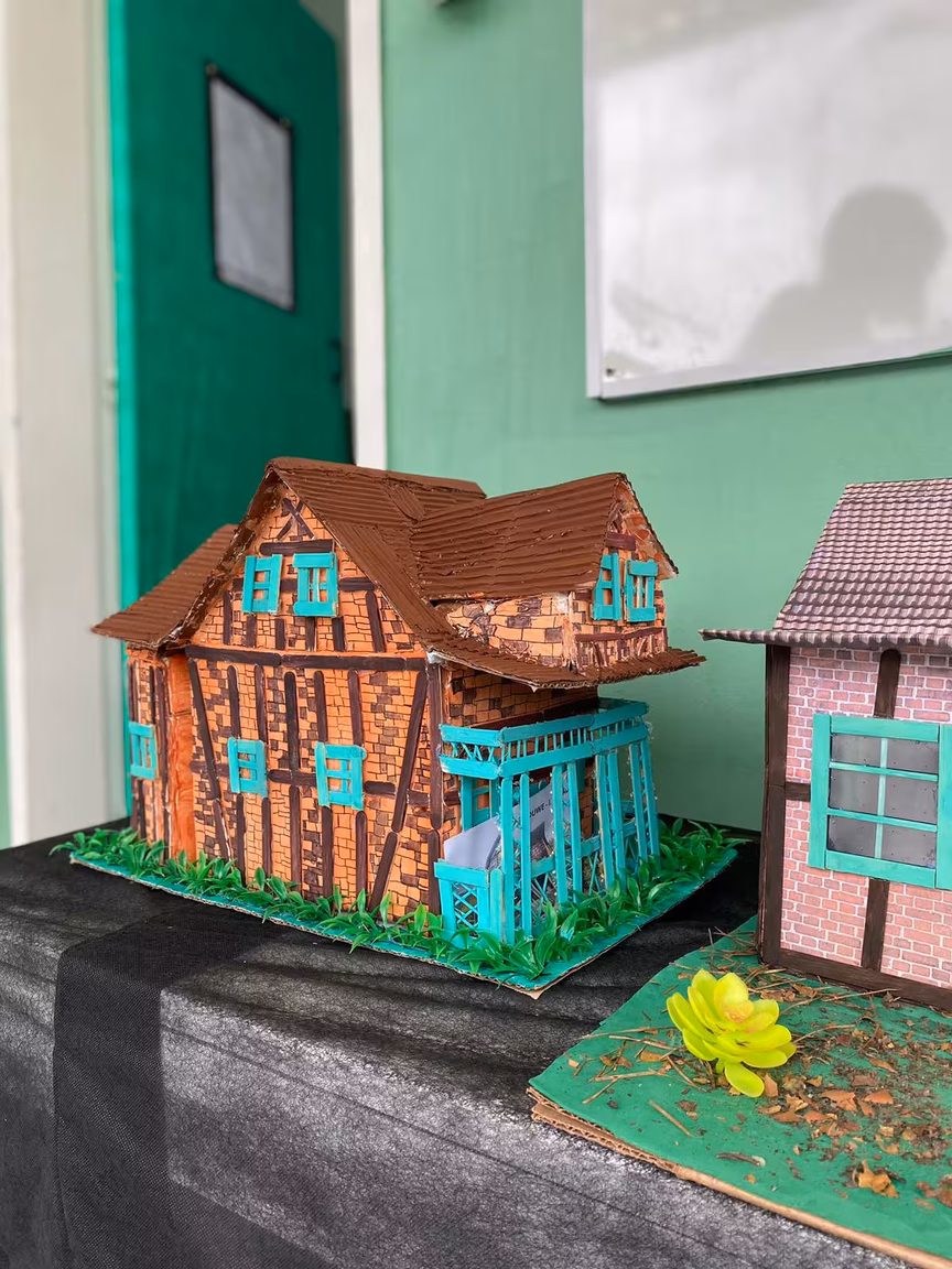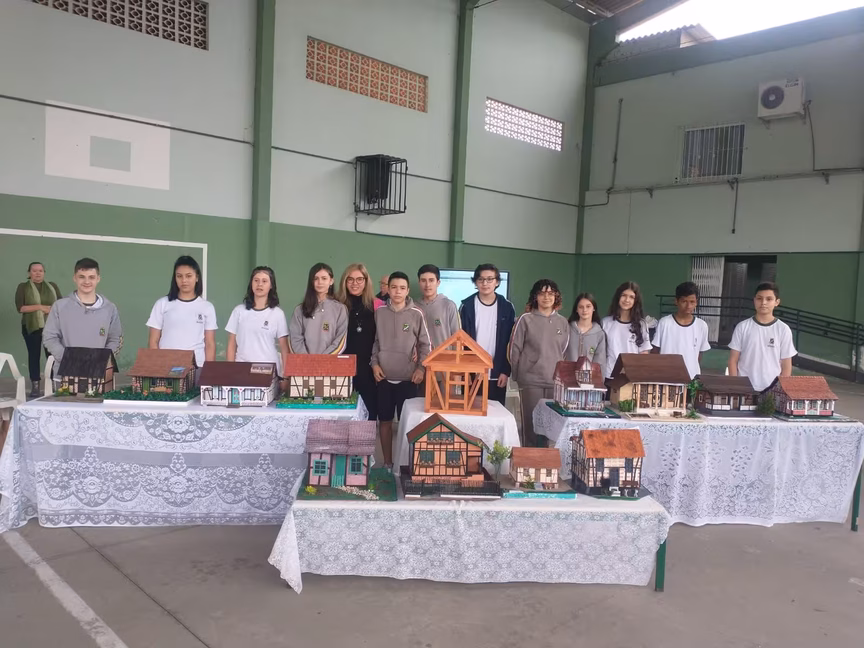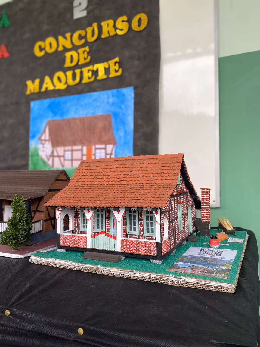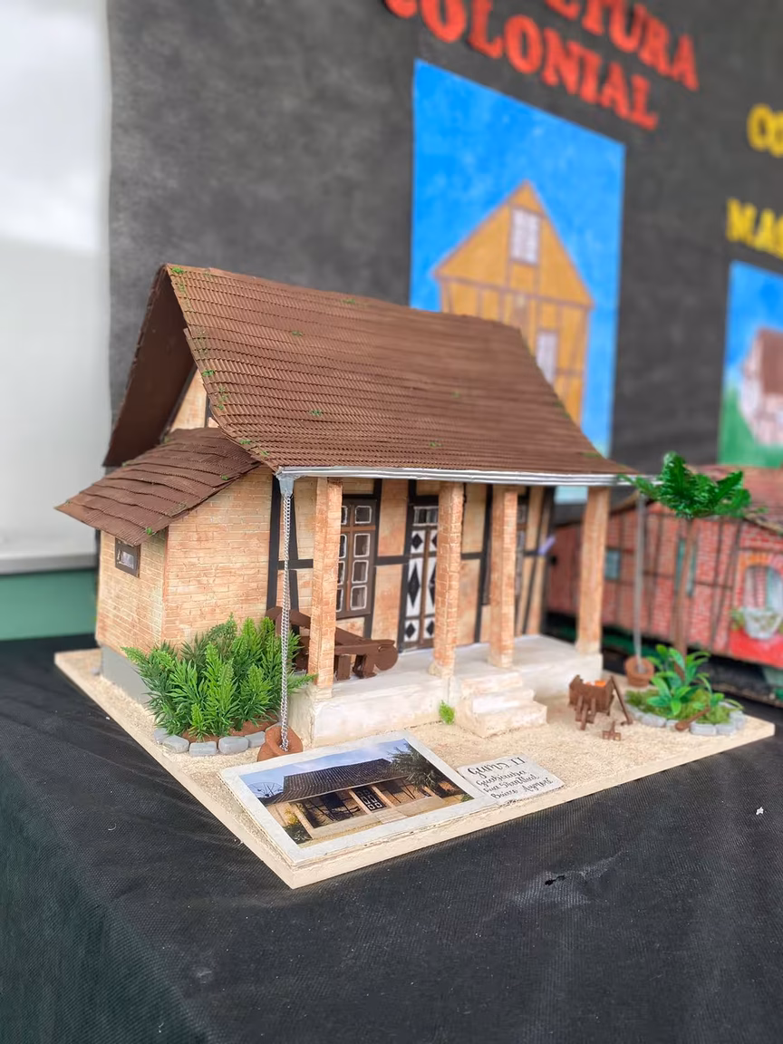 Para isso, os alunos tiveram que construir uma maquete 3D inspirada na arquitetura colonial com a técnica de construção enxaimel, que esteve muito presente no processo de colonização de Santa Catarina nos séculos 19 e 20.
