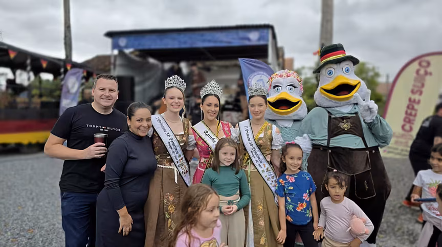 Ao som das típicas bandas germânicas, a rainha e as princesas foram recebidas com entusiasmo, acompanhadas dos figurantes caracterizados como marrecos, ícones das celebrações tradicionais da cidade.