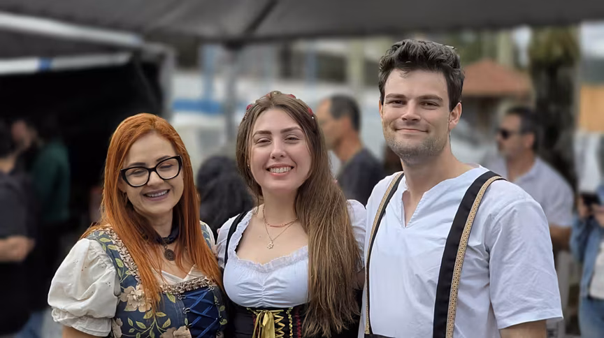 O desfile improvisado pelo pátio do clube não apenas coloriu a festa, mas também reforçou a ponte entre duas celebrações que fazem parte da identidade cultural de Brusque.
