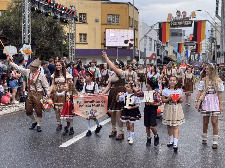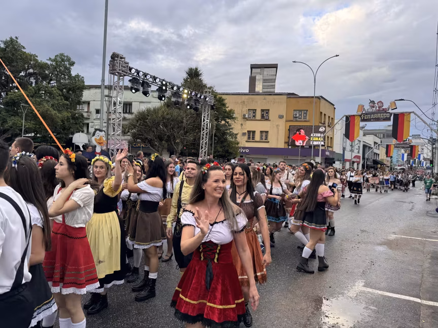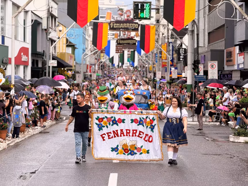 Mesmo com a garoa, milhares de pessoas participaram do desfile da 37ª Fenarreco, em Brusque. A atração, que havia sido adiada de quinta-feira, 10, para este sábado, 12, por conta da chuva, começou às 17h, quando a chuva deu uma trégua.
