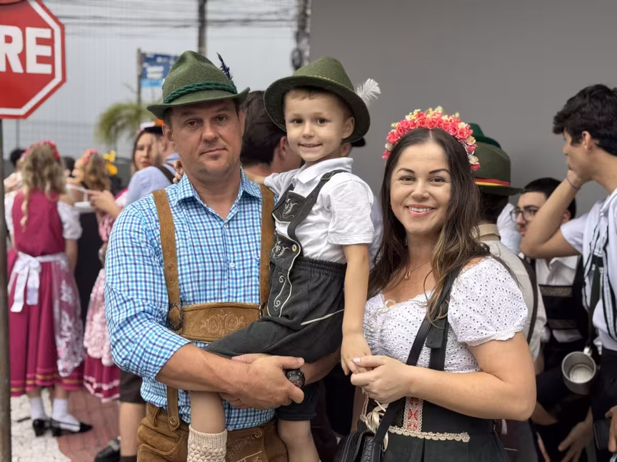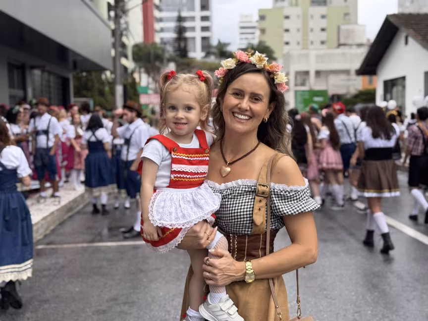 Outra participante foi Maria Izabel Hoefelmann, que estava com a sobrinha Isis, que completará 3 anos nesta segunda-feira, 14. “A gente veio participar e prestigiar. Não importa se é com chuva ou não, é também o meu primeiro desfile. A Isis conhecerá a Fenarreco neste ano”, completa.