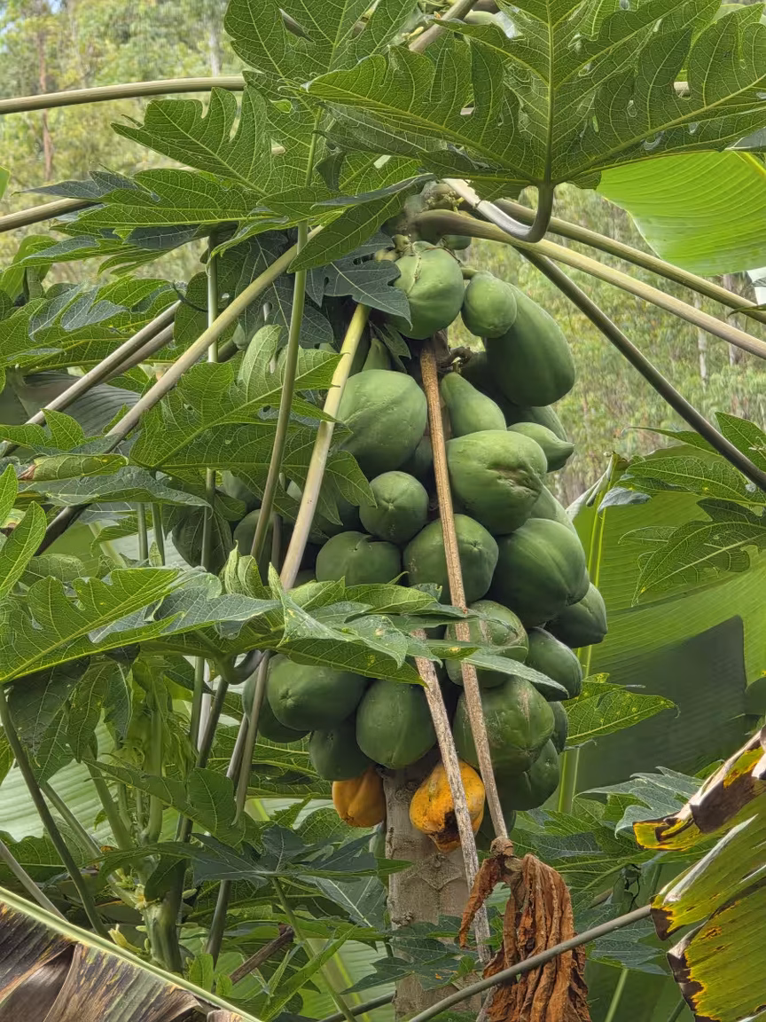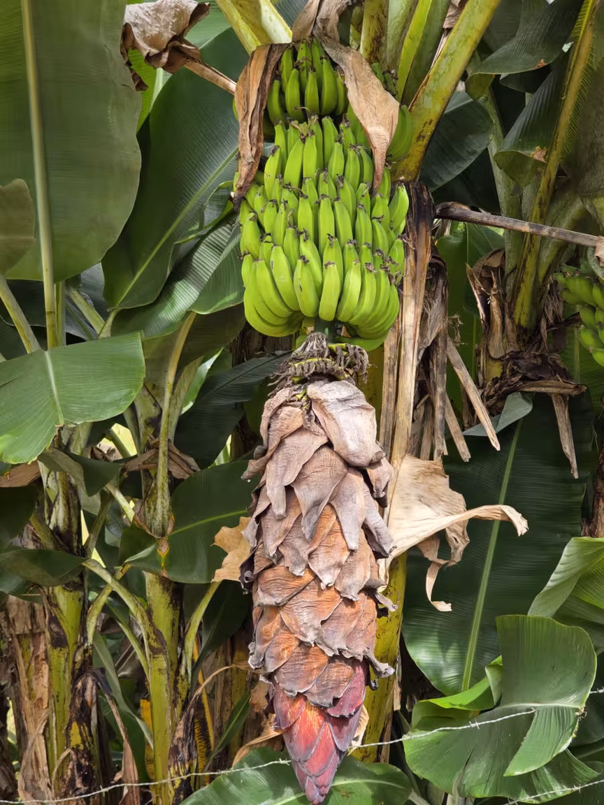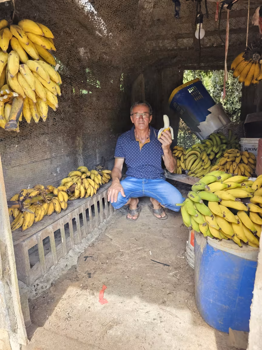 Entre suas colheitas, os cachos de banana são um verdadeiro troféu, pendendo dos galhos como medalhas douradas concedidas pela própria terra.