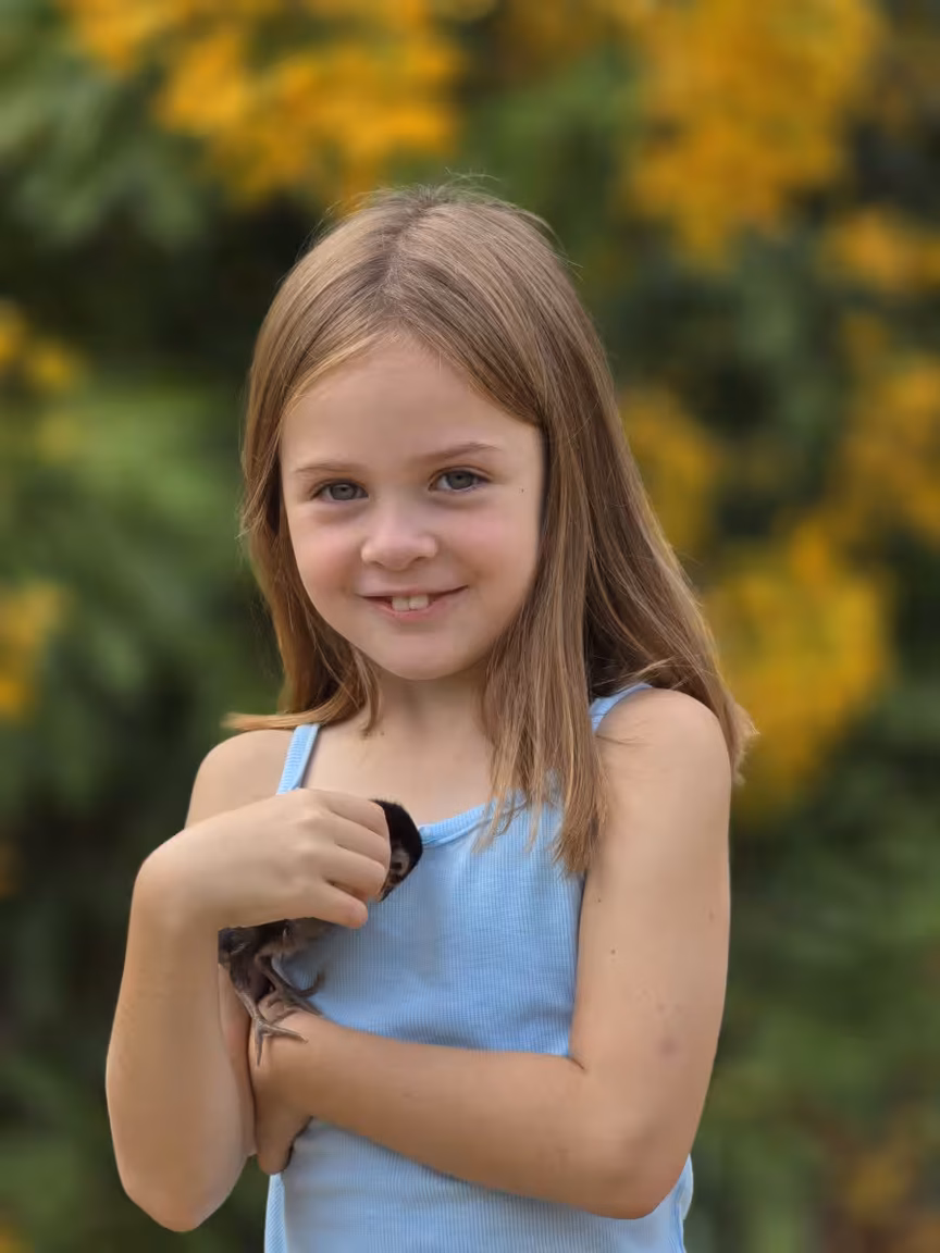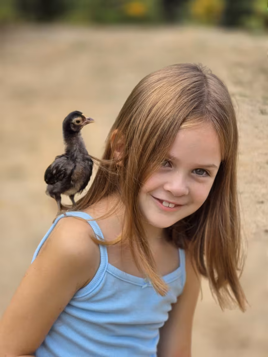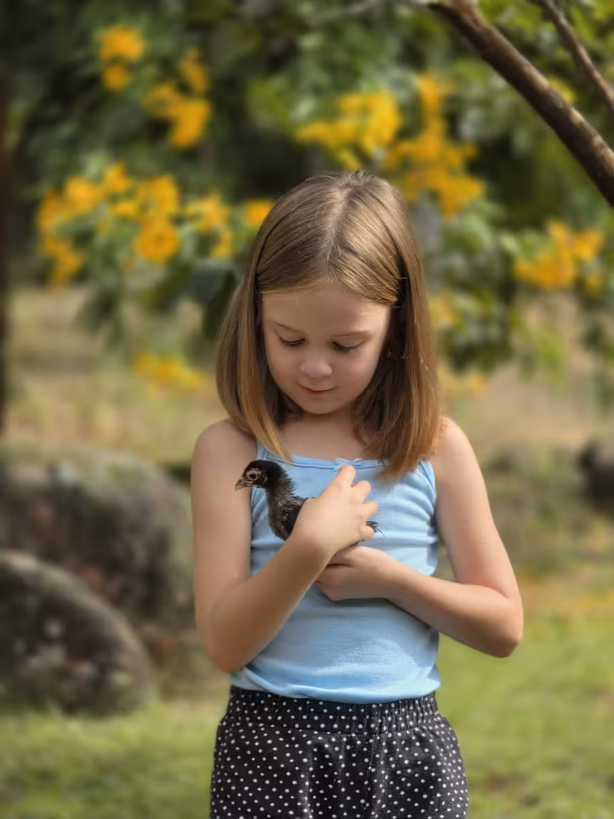 Mesmo com pouca idade, ela já absorve o encanto interiorano, correndo entre os canteiros e dividindo sua infância com um companheiro inusitado: um pintinho, que desde que saiu da casca tornou-se seu fiel amigo de estimação.