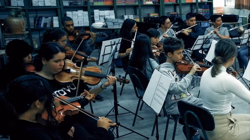 Os alunos irão apresentar um repertório de músicas populares dentro de uma formação orquestral inicial que inclui violinos, viola e flautas transversais.