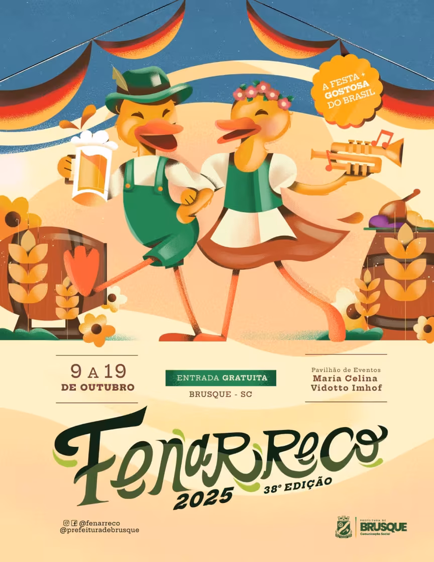 A Prefeitura de Brusque apresentou nesta segunda-feira, 14, em evento com a imprensa no Hotel Monthez, a nova identidade visual da Festa Nacional do Marreco (Fenarreco). A edição de 2025 é a 38ª do evento e acontece entre 9 e 19 de outubro, no Centro de Eventos Maria Celina Vidotto Imhof.