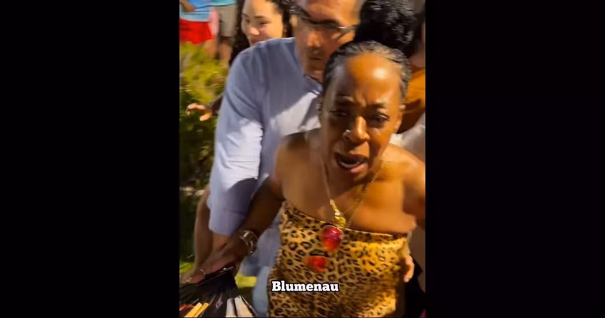 No começo é possível perceber que ela não entende o nome da cidade. “O que é isso? Quem é?”, ela pergunta. Assim que é explicado que é uma cidade de Santa Catarina e onde é realizada a Oktoberfest, ela consegue compreender e manda um alô simpático.