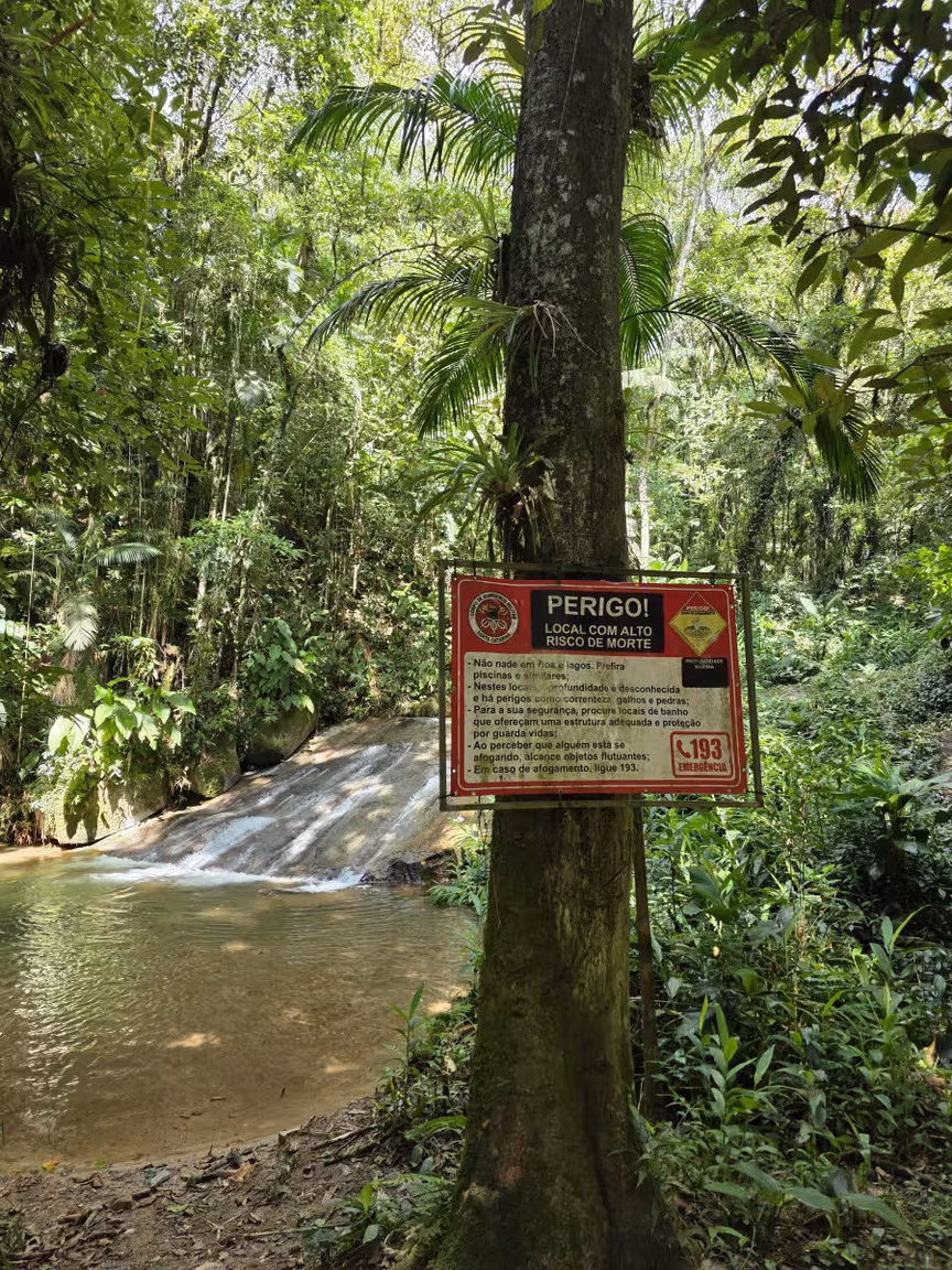 A cascata, além de não ser muito alta, forma um poço de profundidade reduzida, permitindo que crianças brinquem com tranquilidade sob o olhar atento dos pais.