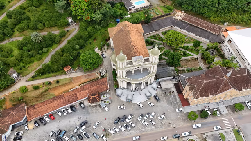 Imagens aéreas, feitas por drone, mostram uma perspectiva única, revelando a imponência da igreja e seus arredores de forma quase mágica.