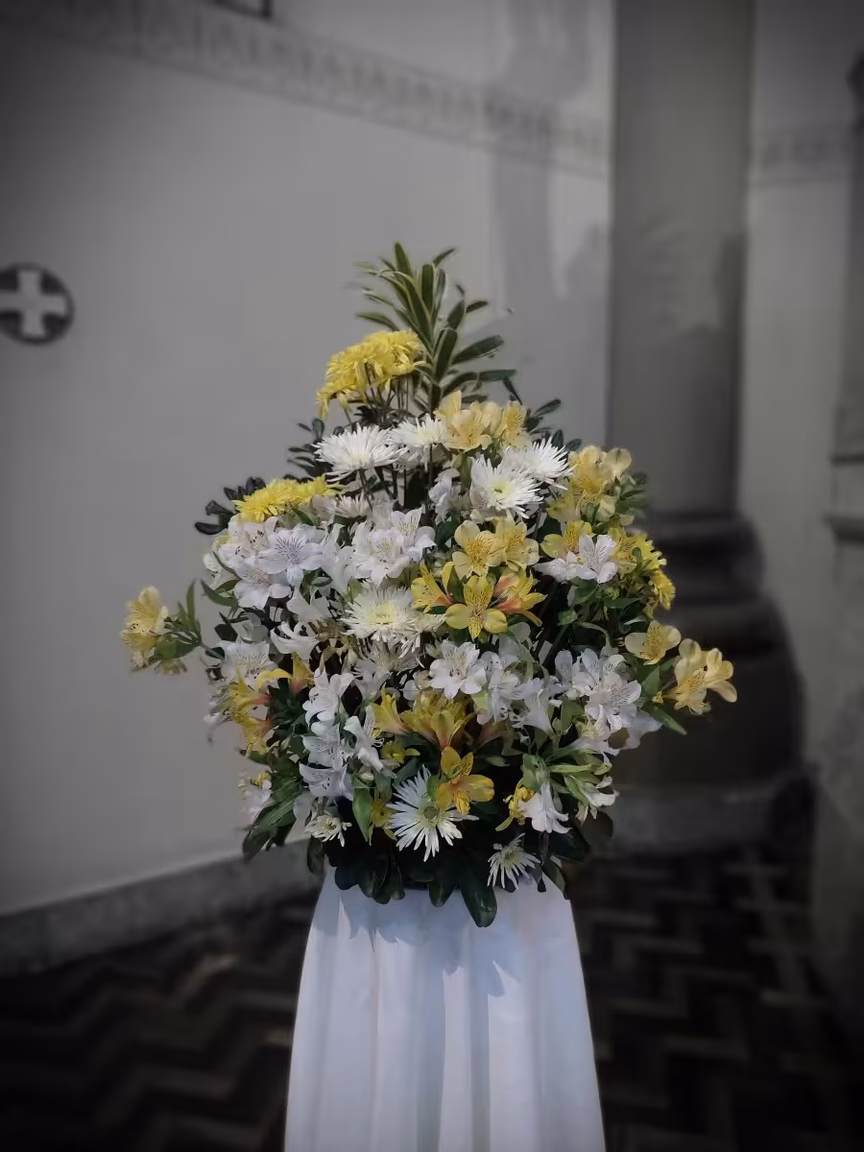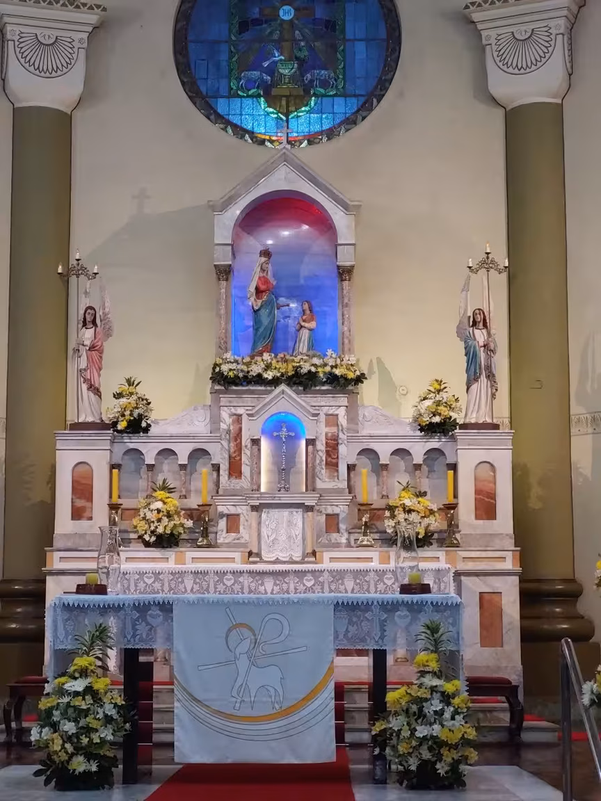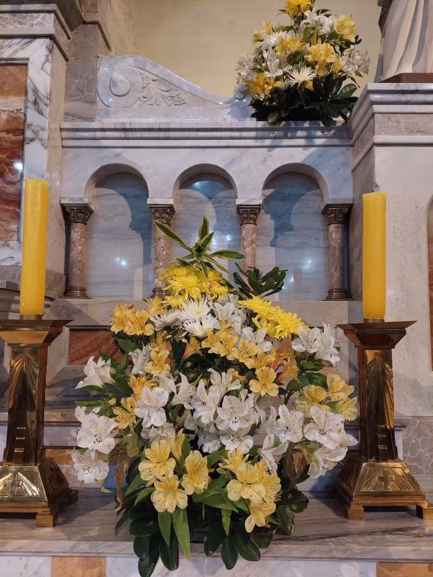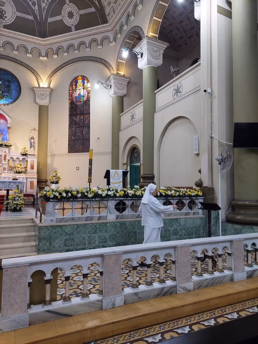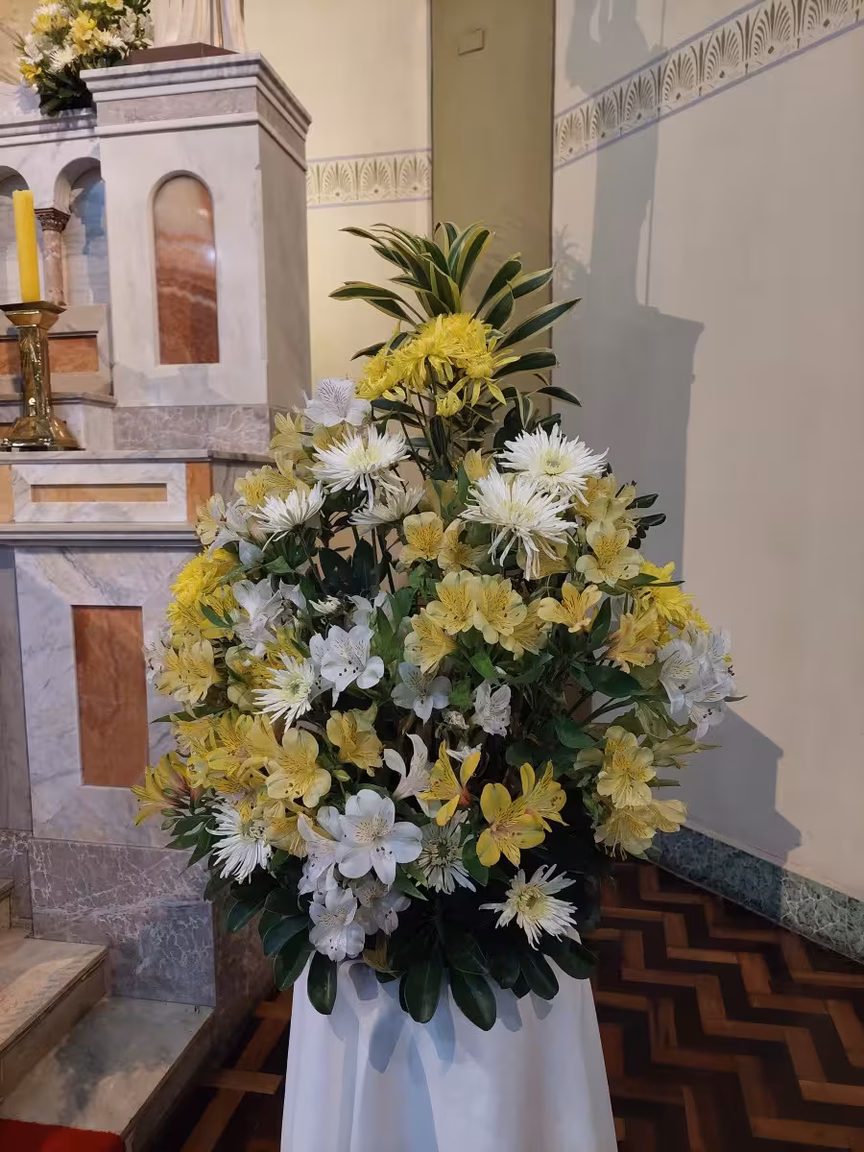 "Nesta época que ainda estamos vivendo o Tempo Pascal, procuramos decorar a igreja de uma maneira especial. Para tanto, usamos 30 maços de astromélia e 5 de crisântemo e tudo chegou desmontado da floricultura", explica a Irmã.