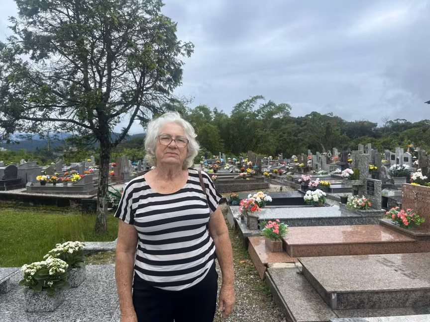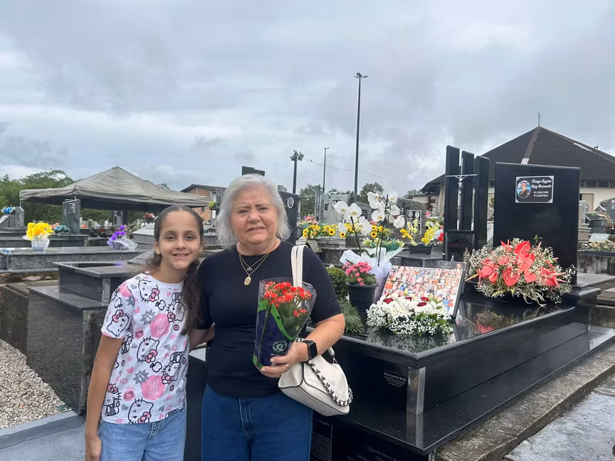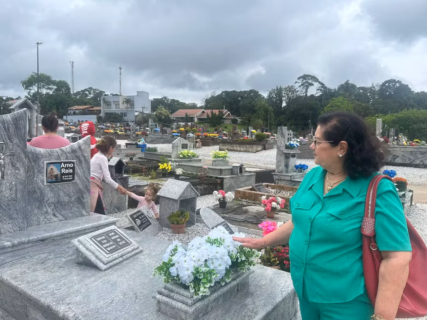 Assim como Jandira, outras famílias encontraram no cemitério não apenas um lugar de saudade, mas também de afeto e memória. Edenize Rieg, moradora do Jardim Maluche, de 63 anos, se emociona ao falar da filha Thaiga, que faleceu aos 31 anos, em 2022. No seu túmulo, estão diversas flores e também um painel com fotos que relembram as marcas que ela deixou em familiares e amigos.