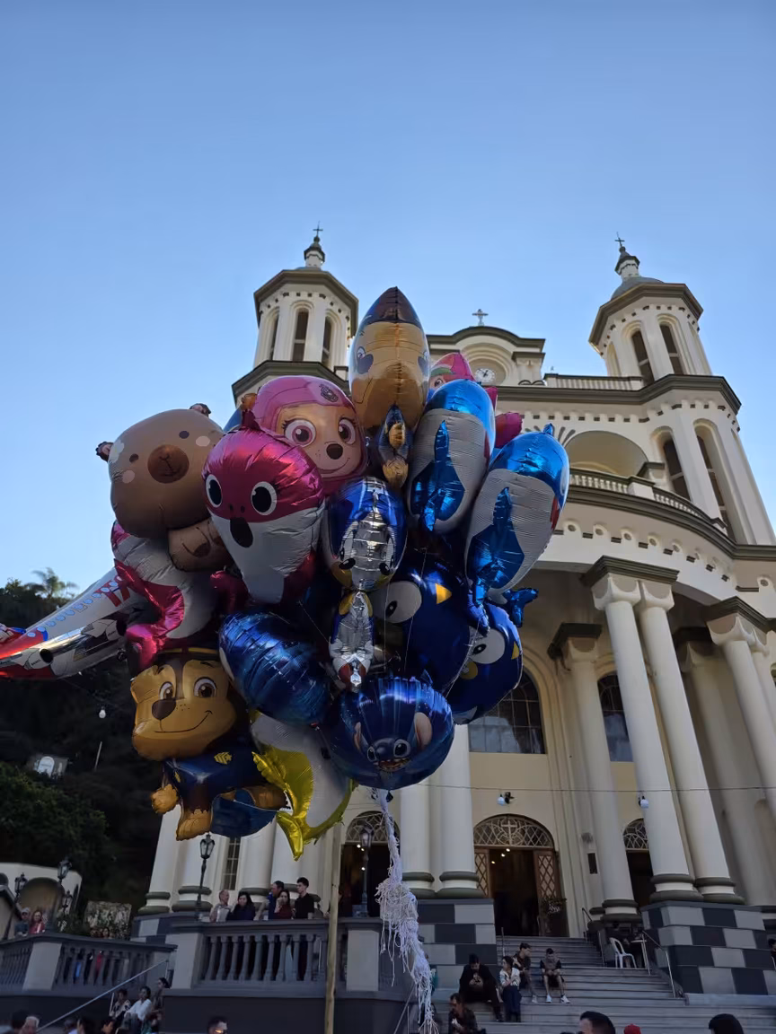 O pátio do Santuário, tradicional ponto de encontro após as celebrações, recebeu novamente barracas com comidas típicas, cafés e artesanatos, compondo uma atmosfera festiva e animada.