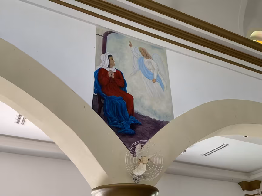 O interior foi decorado com dezesseis pinturas de Pedro, doze delas foram apagadas durante o ministério do padre Francisco Alves, entre 2001 e 2004.