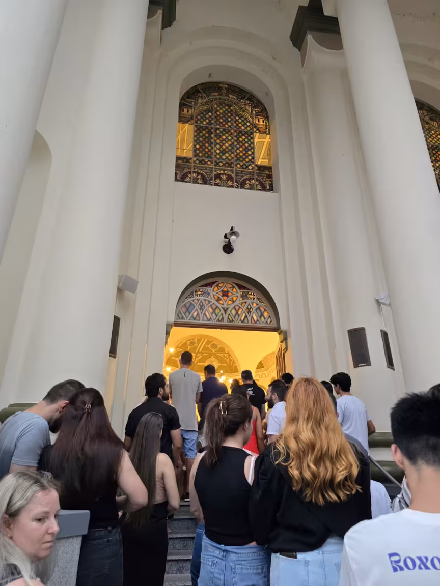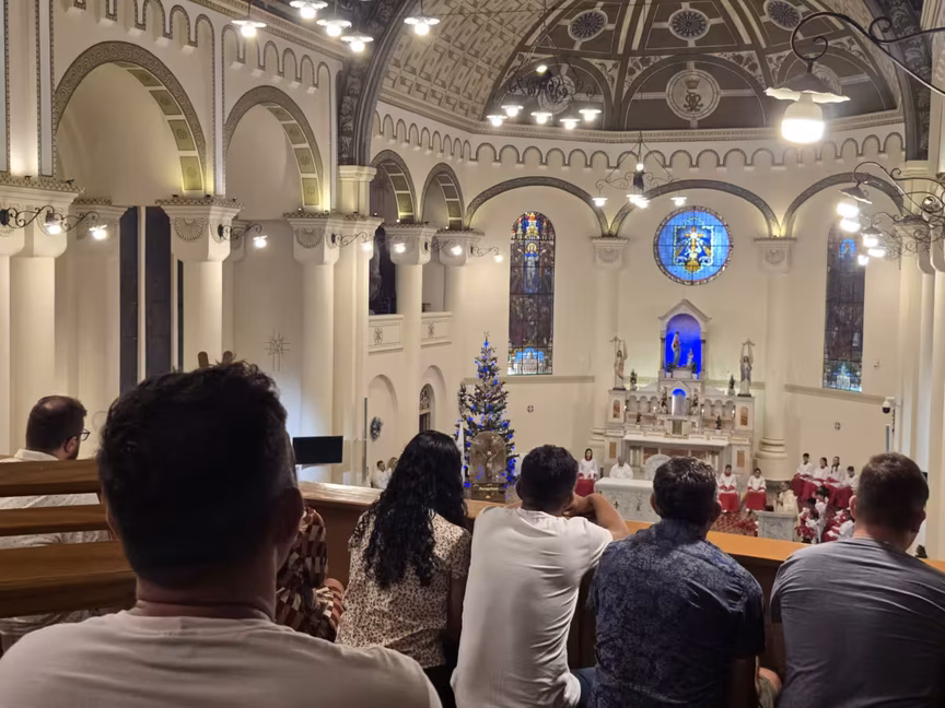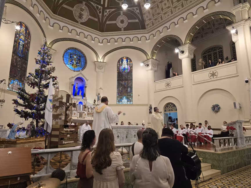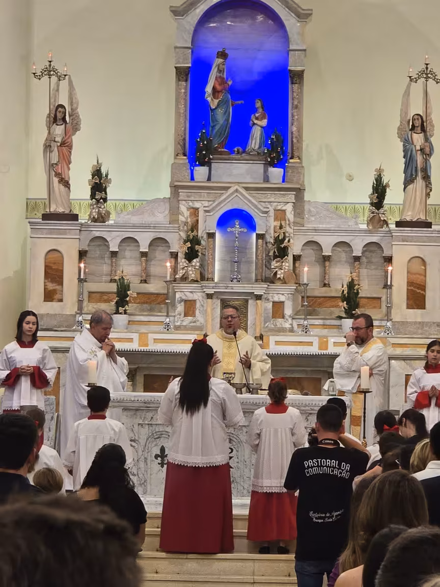 O santuário estava completamente lotado, com fiéis ocupando cada espaço disponível, incluindo áreas externas, onde muitos acompanhavam a cerimônia com olhares atentos e emocionados.