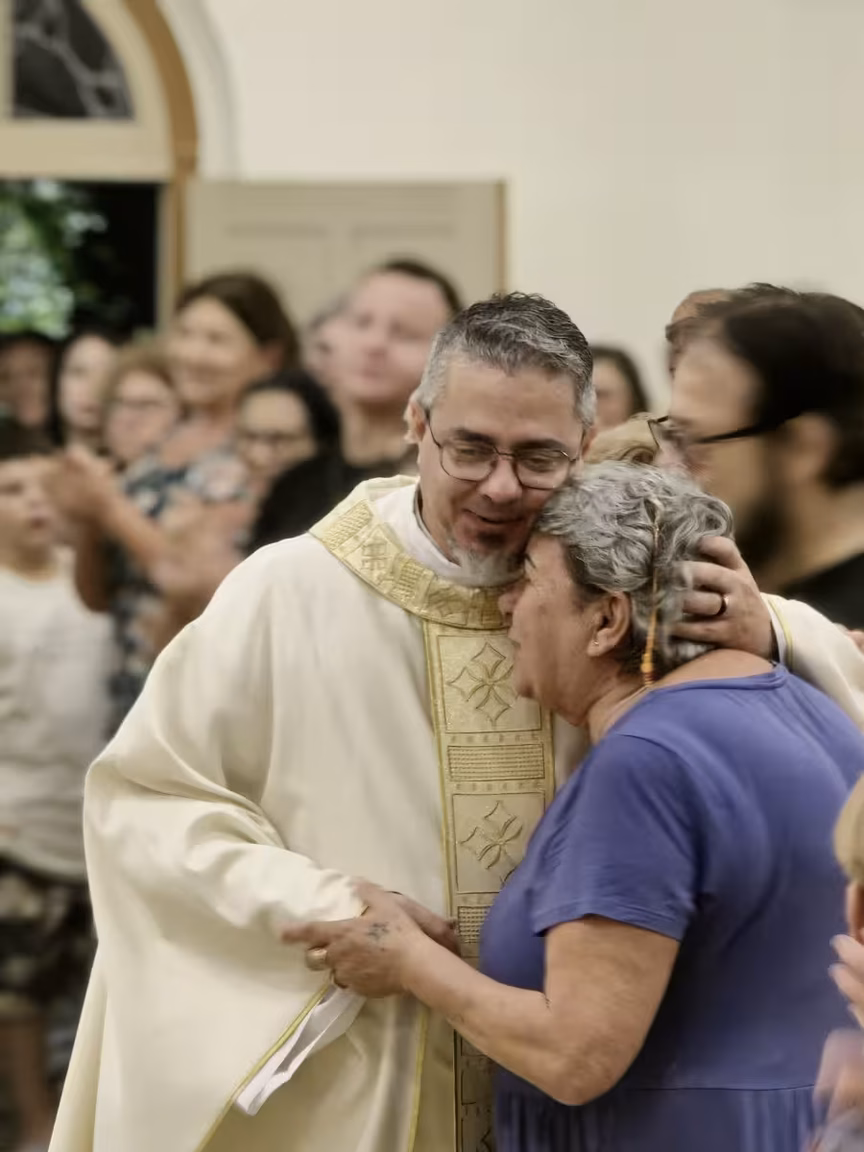 Presidindo a celebração com a mesma energia que sempre marcou sua atuação, o padre Eduardo não conseguiu esconder a emoção que brilhava em seus olhos.