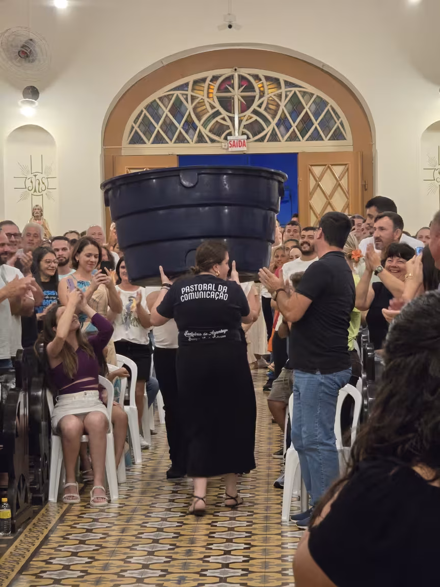 Um dos momentos mais comentados foi a entrega de uma caixa d'água, uma alusão ao mergulho irreverente do padre Eduardo no inverno de 2024, quando convidou a comunidade para a tradicional Festa de Azambuja, de uma forma criativa e descontraída.