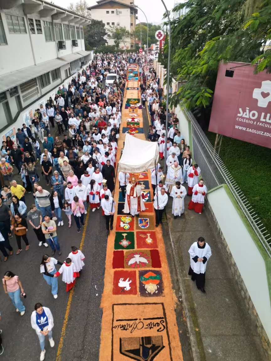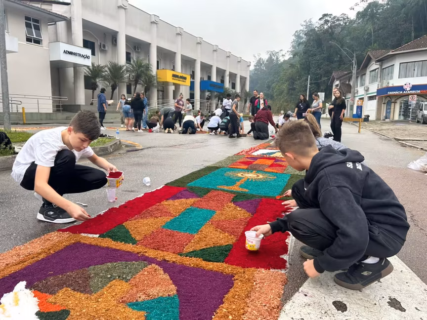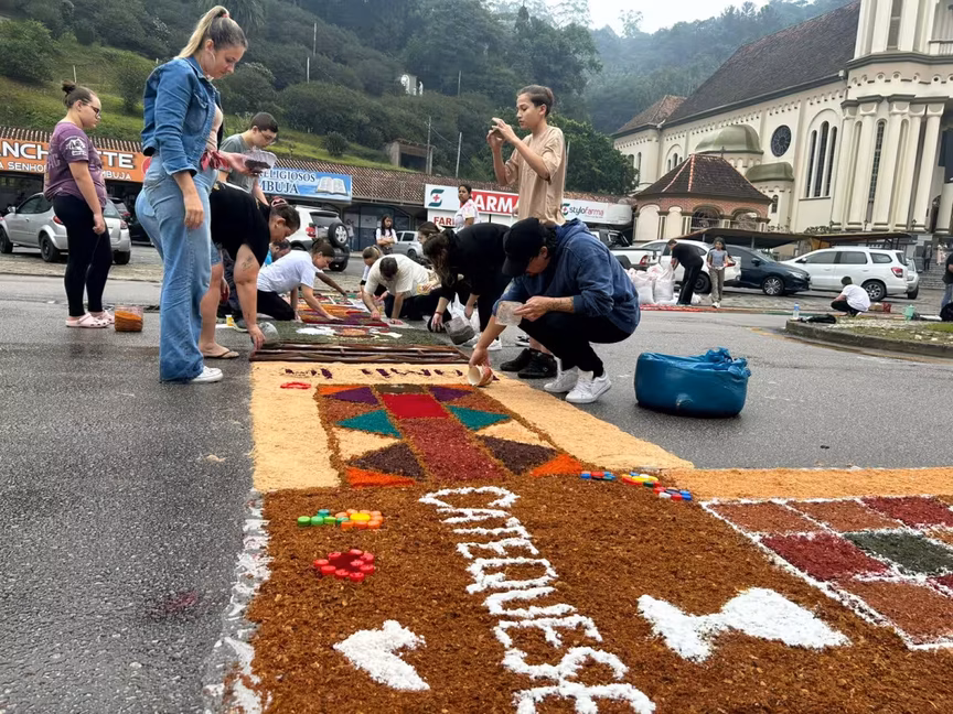 A comemoração de Corpus Christi é uma data muito significativa para os católicos e, nesta quinta-feira, 19, fiéis se reuniram em frente ao Santuário de Azambuja, em Brusque, para confeccionar os tapetes que marcam a data tradicionalmente.