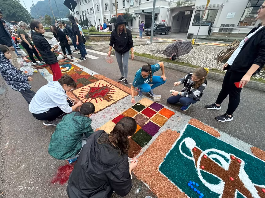 Sob chuva, fiéis mantêm a tradição de confeccionar tapetes no dia de Corpus Christi em Brusque