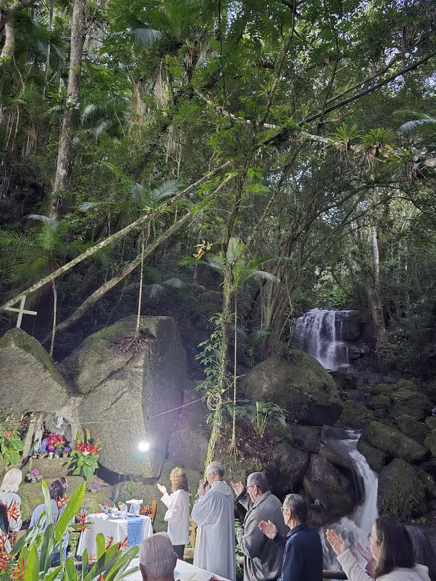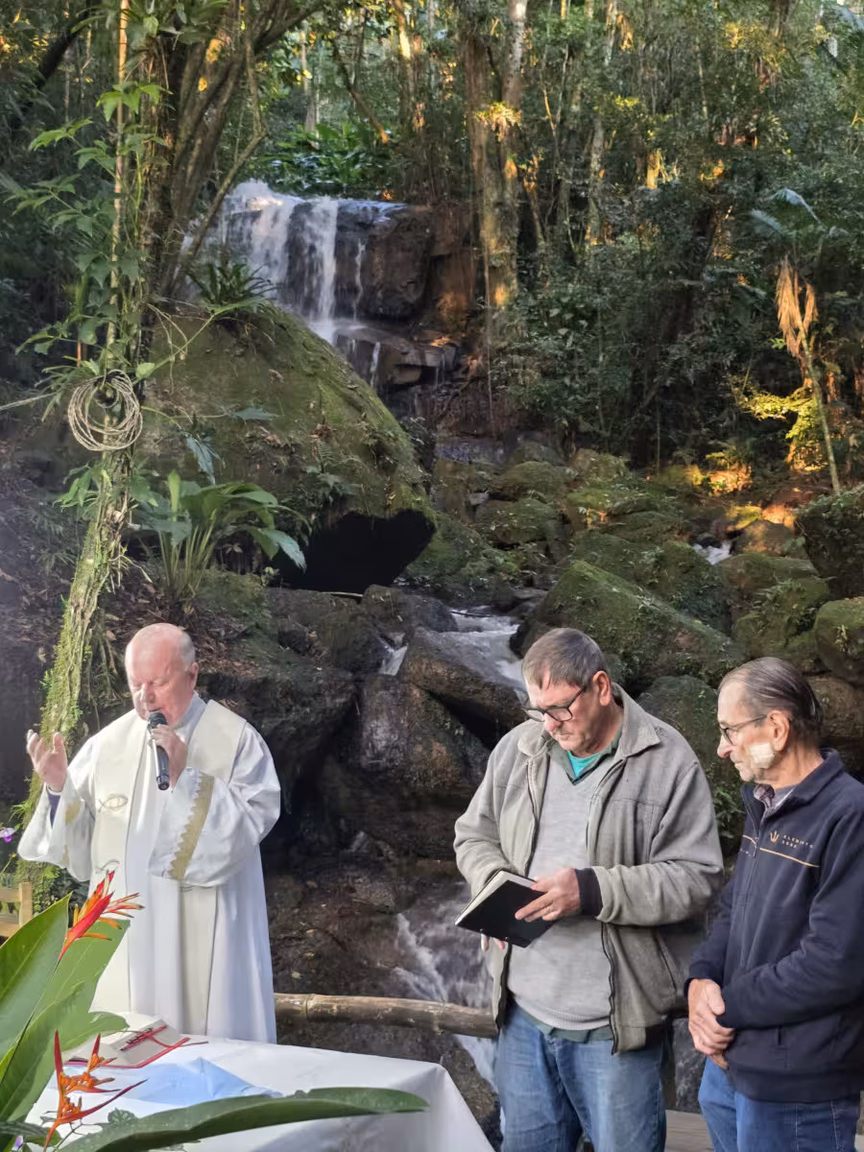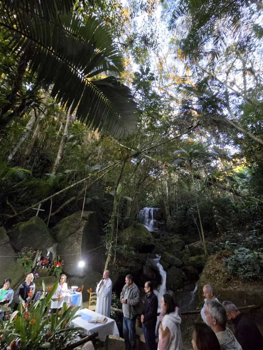 Uma missa foi então celebrada na encantadora Gruta do Vô Ricardo, situada no meio da mata, tendo a sinfonia natural de uma cachoeira como pano de fundo.