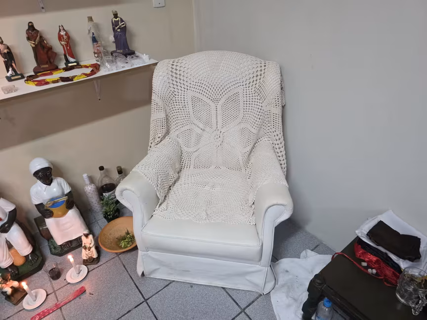 A casa trabalha com encantados — entidades que transitaram para o plano espiritual em corpo e alma —, além de caboclos, pretos-velhos, Exus e Pomba-Giras, figuras centrais na Umbanda.