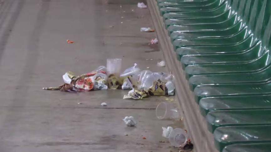 Dois dias após o fim do Jogo das Estrelas – entre Amigos do Ronaldinho Gaúcho e Amigos do Zé Roberto – o acúmulo de lixo nas arquibancadas da Arena Brusque ainda não havia sido completamente limpo.