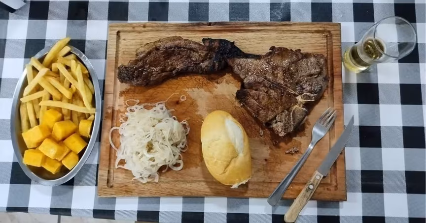 O prato vem completo: um pedaço de carne, cebola, pão e uma porção com polenta e batata frita. Há várias mesas no local e os clientes podem assistir a jogos de futebol que passam no telão enquanto degustam o prato.
