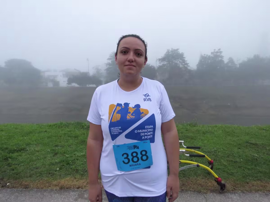 Bruna já adianta: "que bom que são três provas porque vamos participar de todas". Ela destaca a organização e qualidade dos materiais distribuídos aos participantes.