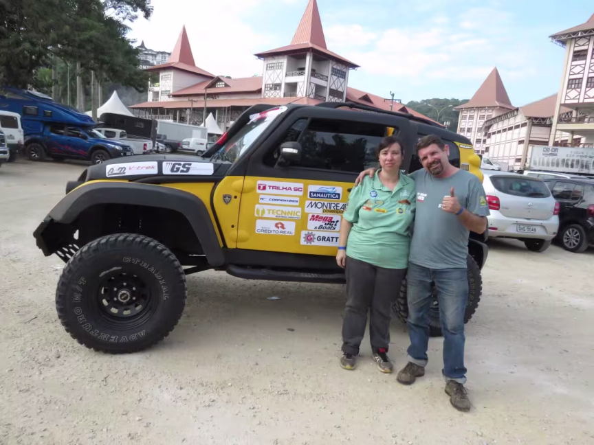 O piloto Gustavo Schmidt, de 27 anos e o navegador Thiago Poisl, de 40, são os líderes do Campeonato Catarinense. Eles vieram a Brusque buscando o terceiro título de etapa consecutivo no ano. A dupla é da equipe GS Racing, equipe recém-formada que participa da Fenajeep pela primeira vez. "Corro rally desde 2002, com meu pai. Comecei a pilotar em 2016, e também somos expositores com a concessionária da Troller", explica Gustavo.