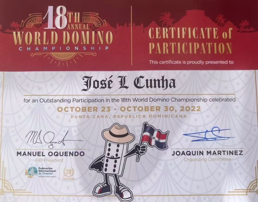 O ex-vereador e ex-prefeito de Brusque, José Luiz da Cunha, o Bóca, retornou no domingo, 30, do 18º Torneio Mundial de Dominó. O evento foi sediado em Punta Cana, na República Dominicana. Ele ficou na terceira posição em jogos e na 11ª posição em pontos, empatando com outros oito competidores.