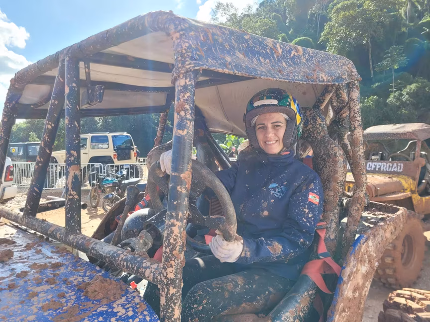 “Em uma prova em 2022, em Rodeio, meu marido tombou o jipe e acabou quebrando o braço. Eu, então, peguei o volante e disse que iria dirigir. Desde então, venho participando das provas. É muito divertido. É um momento que nos desestressa e a adrenalina vai lá em cima”, diz.