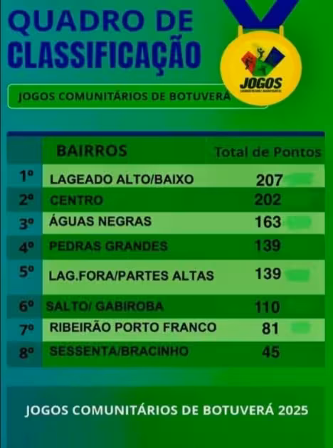 Na classificação geral dos Jogos, Lageado Alto/Baixo assegurou o primeiro lugar, seguido pelo Centro na segunda colocação, e por Águas Negras, que finalizou em terceiro.