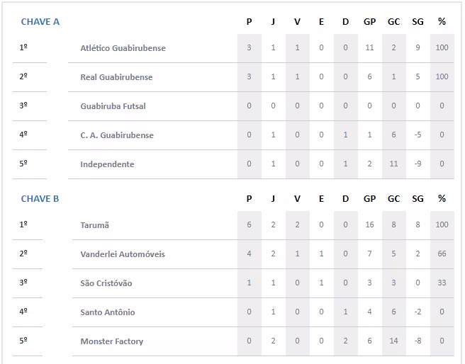 A maior goleada ficou por conta do Atlético Guabirubense, que venceu o Independente por nada menos que 11 a 2. A partida com mais gols, no entanto, foi a vitória do Tarumã sobre o Monster Factory por 10 a 4. A equipe lidera a chave B, com duas vitórias em seus dois jogos.