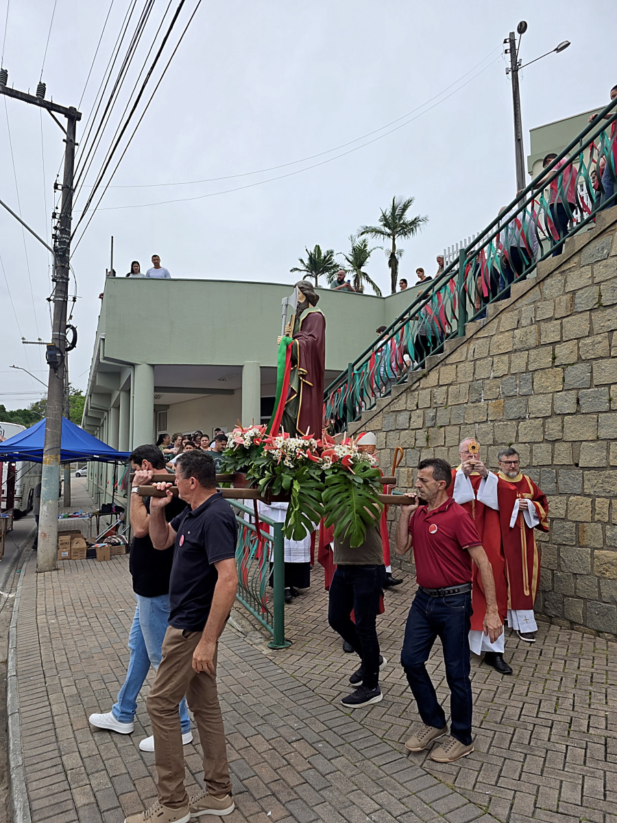 Antes da missa solene das 9h, uma procissão percorreu as ruas do entorno, conduzindo a imagem do padroeiro em meio a cânticos e manifestações de fé.