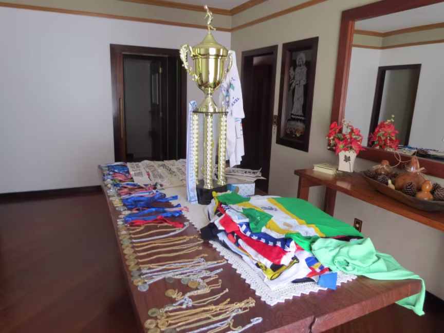 Moninho apresentou uma quantidade infindável de taças, medalhas e fotos dos tempos áureos no campo, nas areias e nas quadras. Também as camisetas: são 46 diferentes mantos que vestiu dos mais variados clubes de Brusque e região. As glórias sempre o acompanharam, e renderam muitas premiações que ele guarda e ostenta com carinho. Ele colocou todos os objetos em cima de uma longa e bela mesa, feita por ele mesmo, que é marceneiro.