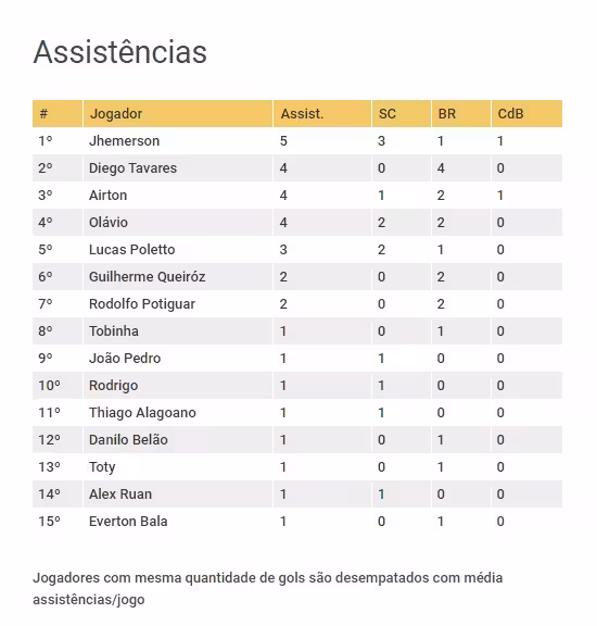 Artilharia, partidas, assistências, pênaltis e cartões por jogador