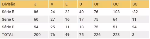 São 76 vitórias, 49 empates e 75 derrotas em todas as divisões, com 226 gols marcados e 221 gols sofridos.