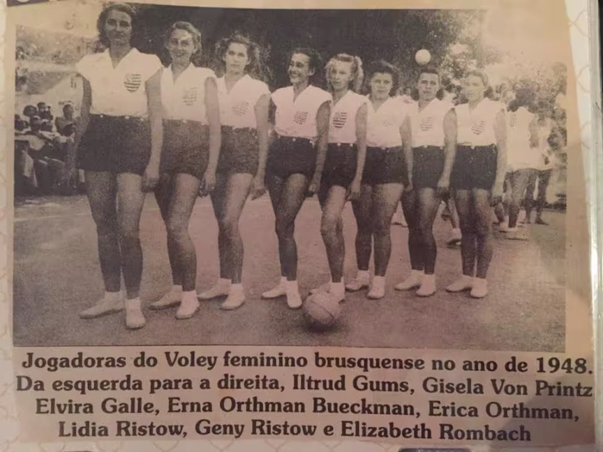 Um registro de 71 anos do "voley" feminino. Iltrud Gums, Gisela von Printz, Elvira Galle, Erna Orthman Bueckman, Erica Orthman, Lidia Ristow, Geny Ristow e Elizabeth Rombach, com os mantos da Sociedade Esportiva Bandeirante, eram tricampeãs estaduais. A imagem foi postada por Aline Hodecker no grupo Curto Fotos Antigas de Brusque, no Facebook.