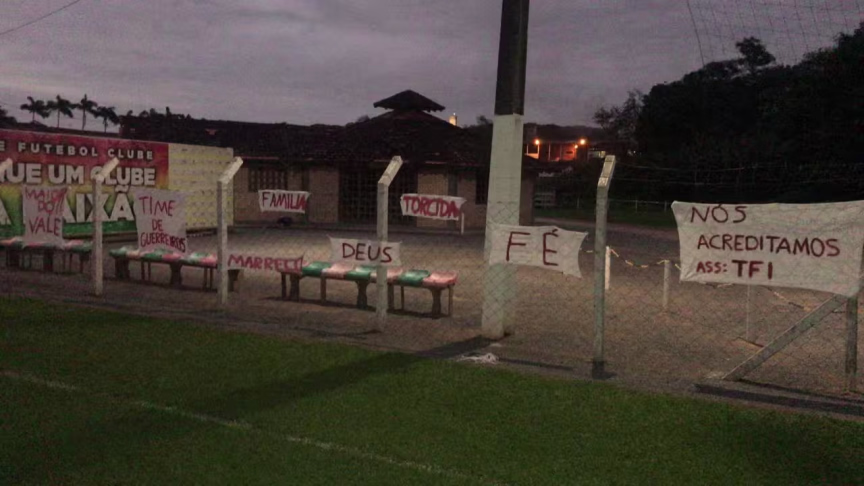 Frases como 'nós acreditamos', 'time de guerreiros' e 'maior do Vale', além de palavras motivacionais como Deus, família e fé, foram colocadas nas grades do campo principal.