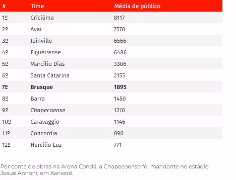 A Chapecoense, por outro lado, vive situação parecida com a do Brusque em 2024. Sem a Arena Condá à disposição, por conta da instalação de gramado sintético, a equipe tem sido mandante no estádio Josué Annoni, em Xanxerê. Receber adversários a cerca de 50 quilômetros de sua casa proporcionou uma média de apenas 1210 torcedores por partida.