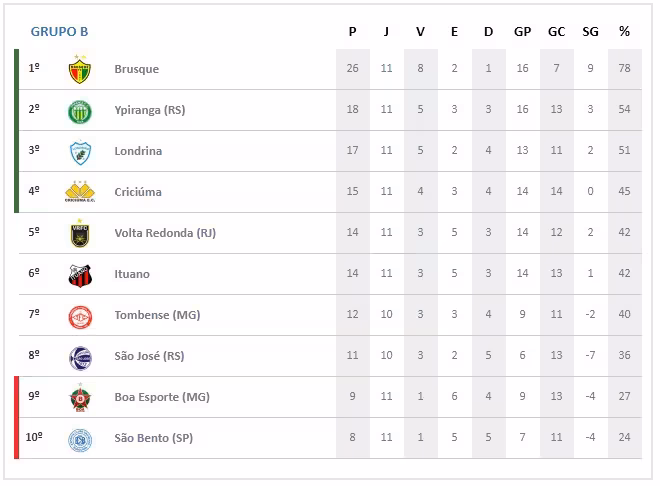 Brusque: Ruan Carneiro; Guilherme Escuro (Emerson Martins 14′-2ºt), Ianson, Everton Alemão, Aírton; Zé Mateus, Rodolfo Potiguar (Ronaell 40′-2ºt); Jefferson Renan (Eliomar 40′-2ºt), Thiago Alagoano (Claudinho 44′-2ºt), Maurício Garcez; Geovane Itinga (Johnny 14′-2ºt).