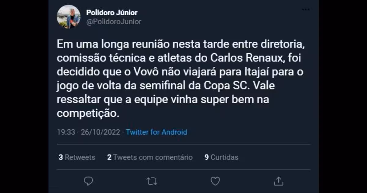 Na postagem que pertenceria ao jornalista Polidoro Júnior é possível ler: "Em uma longa reunião nesta tarde entre diretoria, comissão técnica e atletas do Carlos Renaux, foi decidido que o Vovô não viajará para Itajaí para o jogo de volta da semifinal da Copa SC. Vale ressaltar que a equipe vinha super bem na competição".