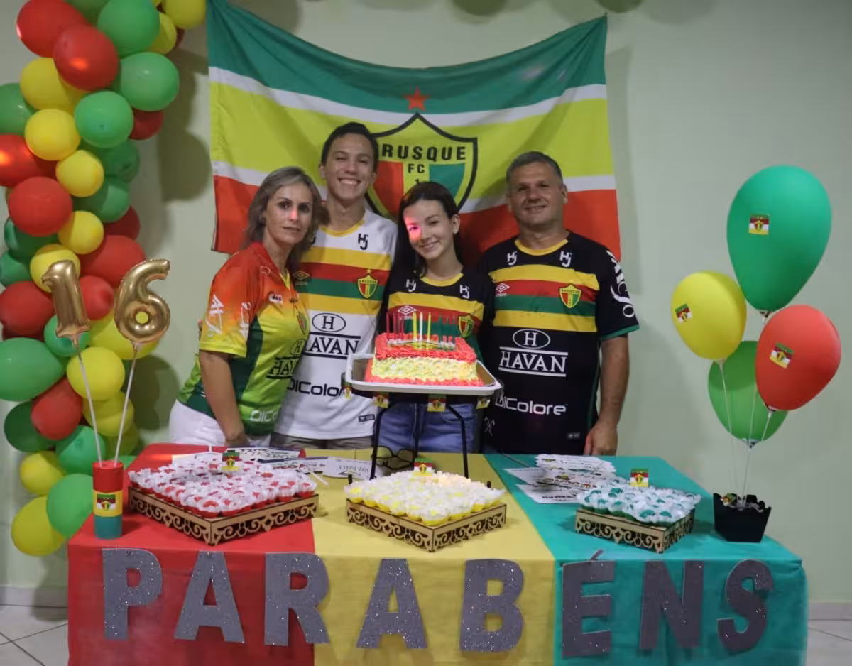 Em boa fase, o Brusque Futebol Clube virou tema do aniversário de dois jovens moradores da cidade. Os torcedores José Luiz Boemer e Vitoria Hoffmann Rubick festejaram seus aniversários de 16 anos juntos, com uma festa decorada com as cores do Bruscão.