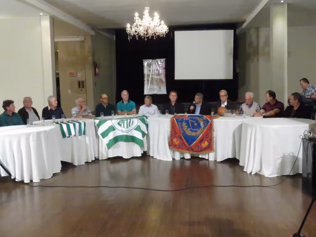 Enquanto o microfone ia passando de mão em mão para cada um daqueles que foram grandes personagens do clássico, alguns elementos chamavam a atenção. As bandeiras dos clubes permaneceram fixas em cima da mesa. A do tricolor, por sinal, uma raridade: ainda levava o antigo nome do clube, Sport Club Brusquense.