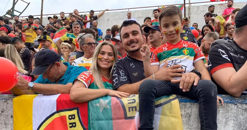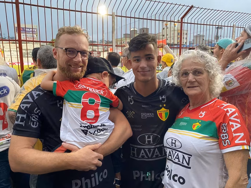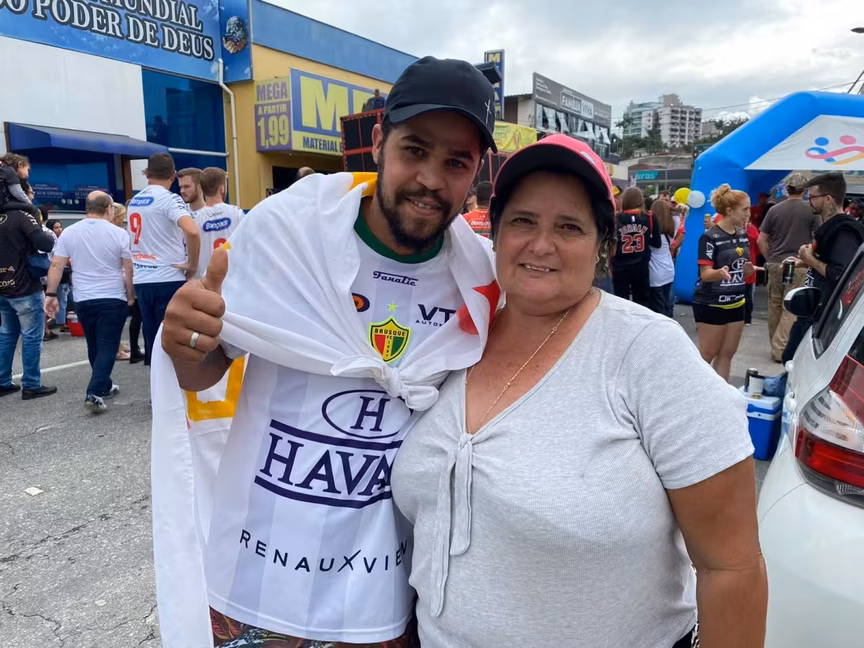 Direto de Itapoá, no Norte do estado, veio a família de Flávio Bechtold, de 37 anos, que trouxe a companheira Edilene Bechtold, 29, que é baiana, e o filho João Vitor, de 7 anos. Eles chegaram neste sábado na cidade e aproveitaram para assistir a final, já que Flávio é brusquense e tem memória afetiva forte com o clube: ele foi atleta amador do Brusque entre 1998 e 2000. “Sem palavras, há 12 anos que não vinha ao estádio. A expectativa é alta e estou trazendo o João pela primeira vez. Quero que ele veja o Bruscão ser campeão”, conta Flávio.