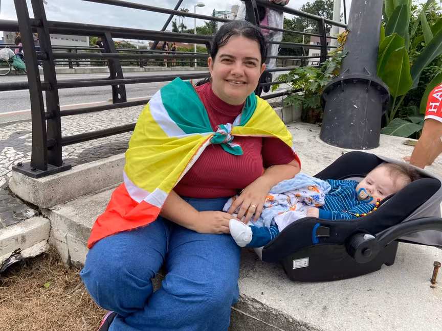 Aline Hodecker Raiser, 32 anos, e o pequeno Joaquim, de 4 meses, acompanharam a grande final do Campeonato Catarinense do lado de fora do estádio. O marido e o filho mais velho de Aline assistiram pelo telão montado pelo clube em frente ao estádio e ela acompanhou o jogo com Joaquim um pouquinho mais afastada do agito, mas torcendo muito pela taça. “Não tem jeito, Bruscão campeão”, diz.